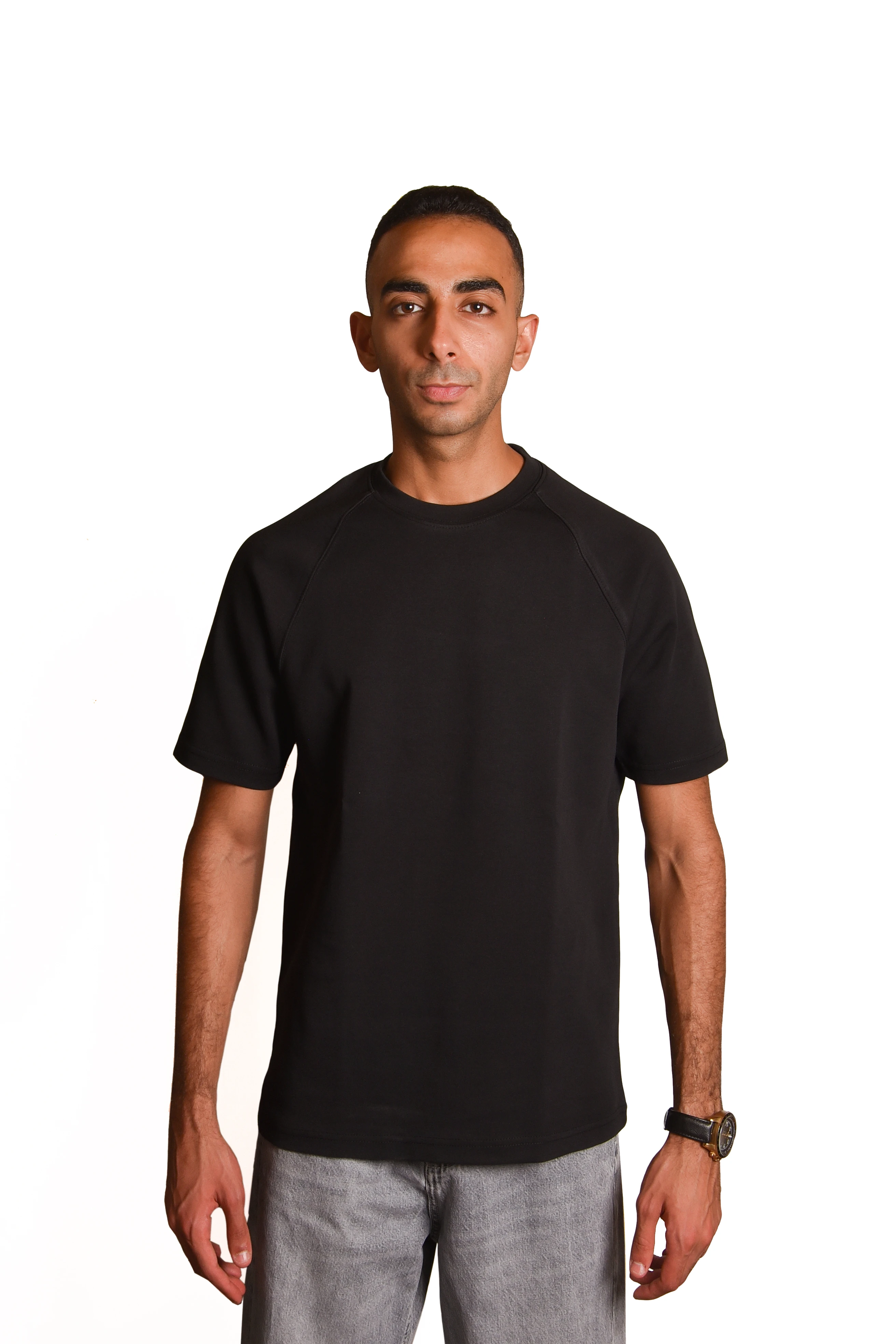 Crafted from premium interlock fabric, the tee provides a soft and smooth feel against the skin while maintaining a structured and durable form. Its high-quality construction ensures that it retains its deep black color and shape even after repeated washing, making it a reliable staple for daily wear.